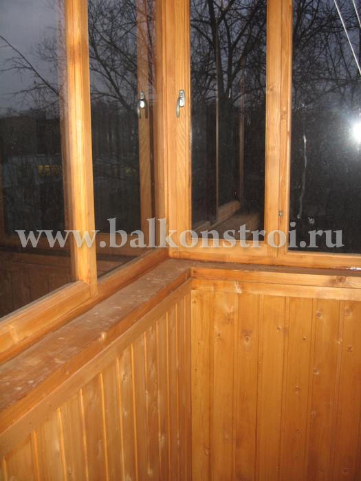Фото обшивки балкона деревянной вагонкой. Для отделки помещения применялся экологически безопасный и долговечный материал, хорошо выдерживающий многократное нанесение краски и лака. Особая конструкция вагонки позволяет крепко скрепить доски между собой. При необходимости заменить испорченный элемент покрытия не нужно демонтировать полностью стену. |
