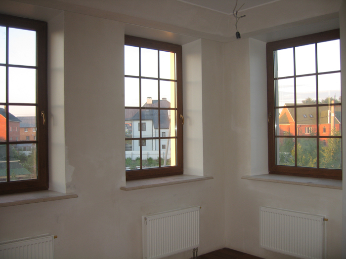 Фото остекления коттеджа, установка окон под ключ. Законченная установка включает произведение точных замеров, изготовление и монтаж оконных систем, устройство подоконника. Рамы распашных створок выполненные из клееного бруса сосны класса "А". Установлена новейшая фурнитура Roto с противовзломной системой. Такое окно станет хорошей защитой на долгие годы. |